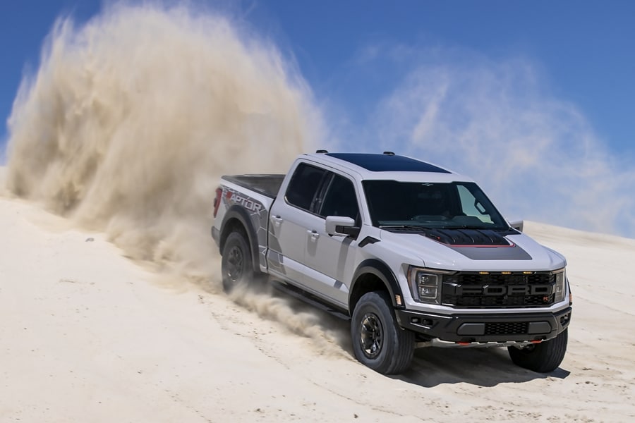 Preproduction model with optional equipment shown. Available late 2022. Professional driver on a closed course. Always consult the Raptor® supplement to the Owner's Manual before off-road driving, know your terrain and trail difficulty, and use appropriate safety gear.
