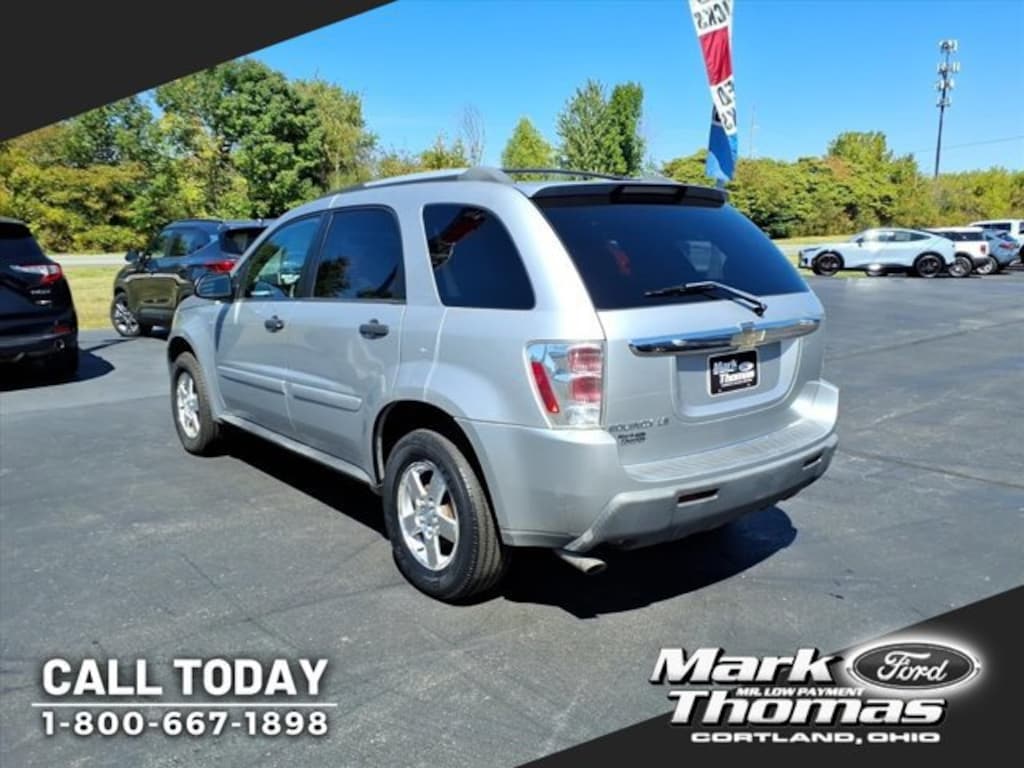 Mark Thomas Ford is proud to offer this great 2005 Chevrolet Equinox in Galaxy Silver Metallic. This 2005 Chevrolet Equinox has passed our comprehensive inspection and comes with the following features; Preferred Equipment Group 1SB (Black Rooftop Luggage Crossbars, Deep Tinted Glass, Electronic Cruise Control w/Set & Resume Speed, and Front & Rear Removable Carpeted Floormats), 16" x 6.5" Cast Aluminum Wheels, 16" x 6.5" Steel Wheels w/Bolt-On Covers, 2.70 Axle Ratio, 4-Wheel Antilock Brakes, 6 Speakers, Air Conditioning, AM/FM radio, Body-Color Front & Rear Bumpers, Bodyside moldings, CD player, Custom Cloth Seat Trim, Driver door bin, Driver vanity mirror, Dual front impact airbags, Four wheel independent suspension, Front anti-roll bar, Front Bucket Seats, Front Center Armrest w/Storage, Front Halogen Fog Lamps, Front Reclining Bucket Seats, Fully automatic headlights, Illuminated entry, Panic alarm, Passenger door bin, Passenger vanity mirror, Power door mirrors, Power steering, Power windows, Radio data system, Rear anti-roll bar, Rear window defroster, Rear window wiper, Remote keyless entry, Roof rack: rails only, Security system, Speed-sensing steering, Split folding rear seat, Spoiler, Tachometer, Tilt steering wheel, Traction Control, and Variably intermittent wipers.